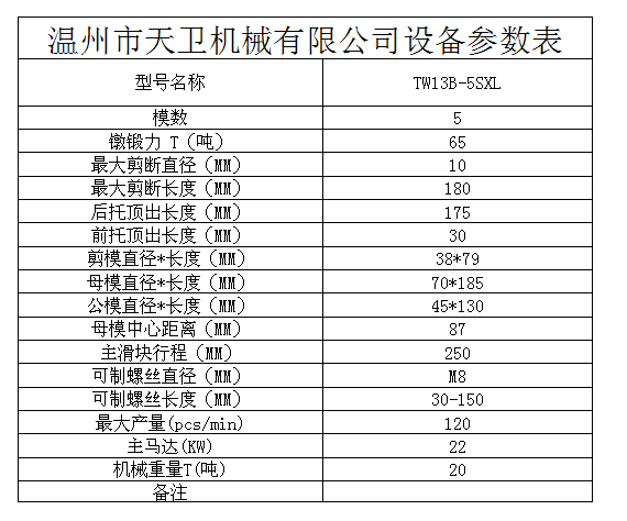 您當(dāng)前的位置:首頁 / 產(chǎn)品中心 / 五模五沖多工位冷鐓機 / └ TW13B(M8)多工位冷鐓機 / TW13B-5SXL全自動多工位冷鐓機